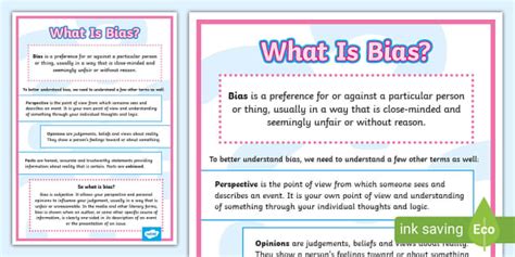 Hey guys! Ever heard the word bias and wondered what it means? Don’t worry; it sounds complicated, but it’s actually pretty simple. Let’s break it down in a way that’s super easy to understand. So, what exactly is bias? In simple terms, bias is like having a favorite—but instead of just liking one flavor of ice cream more than another, it’s about preferring one thing, person, or idea over others, often without even realizing it. It’s like when your friend always picks the same game at recess, even if others want to try something new. That friend might have a bias toward that particular game. This preference isn’t always a bad thing; sometimes, it just means you have a strong interest or a habit. However, bias can become tricky when it affects how fair we are to others. Imagine a coach who always picks the same players for the team, even if other players are just as good. That coach might be biased toward those players, which isn’t really fair to the rest of the team. Understanding bias is the first step in making sure we treat everyone fairly and give everyone a chance. Recognizing that we all have preferences and learning to look beyond them is super important. Bias can show up in many ways and can influence our decisions without us even knowing it. For example, if you see a movie with a superhero who looks just like you, you might automatically think it’s the best movie ever! That’s because you might have a slight bias toward characters that you can relate to. But what if another movie has a different kind of superhero? It’s important to give it a chance too, right? Bias can also come from the things we hear from our family, friends, or even on TV. Sometimes, we might start to believe something is true just because we’ve heard it a lot, even if it’s not based on facts. That’s why it’s always a good idea to ask questions and find out more information for yourself. So, being aware of what bias is, how it works, and how it can affect our actions and thoughts is super important for being fair and kind to everyone around us.