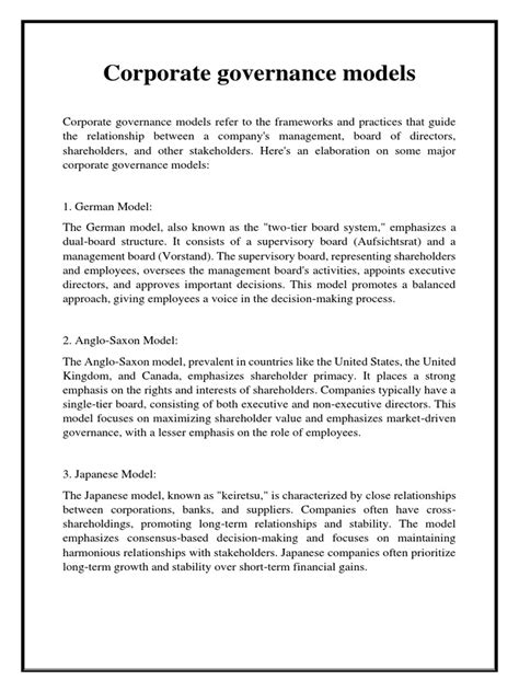 Key characteristics of the German model include: a stakeholder-focused approach, the two-tier board system with employee representation, strong bank involvement, and a legal framework that emphasizes long-term stability and social partnership. This model is often praised for its stability, its focus on employee welfare, and its contribution to social cohesion. It tends to foster a more collaborative approach to business, where management, employees, and other stakeholders work together towards common goals. However, critics sometimes point to potential inefficiencies, slower decision-making due to the complexity of the board structure, and a potential for reduced flexibility compared to more shareholder-driven models. Despite these critiques, the German model remains a powerful example of how corporate governance can be structured to balance diverse interests and promote sustainable business practices. It’s a system that truly tries to bring everyone to the table.