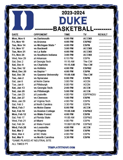 What’s up, basketball fanatics! Are you ready to dive deep into the Duke basketball schedule for the upcoming 2023-2024 season? You’ve come to the right place, guys! Whether you’re a die-hard Blue Devils fan or just someone who appreciates some top-tier college hoops, keeping track of when and where Duke is playing is key. This season promises to be an electrifying ride, filled with intense rivalries, thrilling upsets, and, hopefully, a deep tournament run. So, grab your Cameron Crazies gear, because we’re about to break down everything you need to know about the Duke basketball schedule , from the non-conference battles that test their mettle to the gauntlet of ACC play that truly defines their championship aspirations. We’ll cover key matchups, important dates, and how you can catch all the action. Get ready to mark your calendars and prepare for some serious Duke basketball!