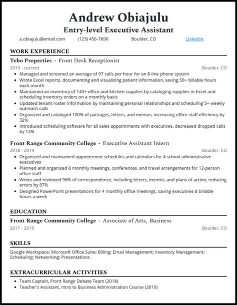 When you’re crafting an entry-level executive administrative assistant resume with no experience , your education section becomes a crucial platform to demonstrate your foundational knowledge and potential. For many entry-level roles, especially those where direct experience is limited, employers place a significant emphasis on your academic background. This is your chance to show that you possess the theoretical understanding and the disciplined approach required for a professional environment. So, let’s make this section work overtime for you! Start with your most recent or highest degree first. Include the name of the institution, the degree you obtained (e.g., Bachelor of Arts, Associate of Science), your major, and the graduation date (or expected graduation date). Now, here’s where it gets interesting for an executive assistant role: relevant coursework . Think about the classes you’ve taken that have equipped you with skills valuable for an administrative position. Did you take courses in business communication, office management, project management, accounting, information technology, or even psychology (for understanding people)? List these specifically. For instance, under your degree, you could add a subsection like: “Relevant Coursework: Business Communication, Introduction to Project Management, Principles of Accounting, Advanced Microsoft Excel, Organizational Behavior.” This immediately signals to the hiring manager that you have been exposed to concepts directly related to the job. Furthermore, if you achieved a strong GPA (generally 3.5 or higher), don’t hesitate to include it. It’s a tangible indicator of your academic diligence and commitment. Awards, honors, and scholarships are also fantastic additions. Dean’s List, academic excellence awards, or scholarships demonstrate a high level of achievement and recognition. These accolades add credibility and show you’re a high-performer. Even if your degree isn’t directly in business administration, you can still highlight aspects of it. For example, if you studied English, you can emphasize your strong writing and editing skills. If you studied a science, perhaps you honed your analytical and research abilities. Frame your educational achievements in a way that connects them to the demands of an executive assistant role. For those who might have taken professional development courses or workshops , these are absolute gold! Did you complete a LinkedIn Learning course on effective time management, or a local workshop on customer service excellence? Add these in a separate section or within your education. They show initiative and a proactive approach to skill development, which are highly sought-after qualities. Remember, the goal is to paint a comprehensive picture of your capabilities. While you might lack the direct executive assistant job titles, your education is a powerful testament to your intelligence, your capacity to learn, and your readiness to apply your knowledge in a professional setting. Make sure this section is detailed and directly links your learning to the requirements of the role you’re applying for, especially when targeting an entry-level executive administrative assistant resume with no experience . It’s all about showing them you’ve got the smarts and the groundwork!