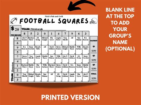 • Printable Templates: Search online for free, printable football squares templates. Many websites offer ready-to-use templates that you can download and print.