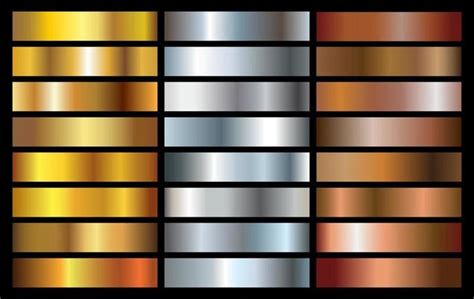 Moreover, the versatility of gold , silver , and bronze gradients allows them to be seamlessly integrated into a wide range of design styles. From minimalist and modern designs to ornate and traditional compositions, these gradients can adapt to suit various aesthetic preferences. This adaptability makes them a valuable asset in any designer’s toolkit, providing endless possibilities for creative expression. The subtle nuances in color and tone can be adjusted to achieve the desired effect, whether it’s a bold and dramatic statement or a subtle and understated accent. So, go ahead and explore the amazing world of metallic gradients and see the magic they can bring to your next project!