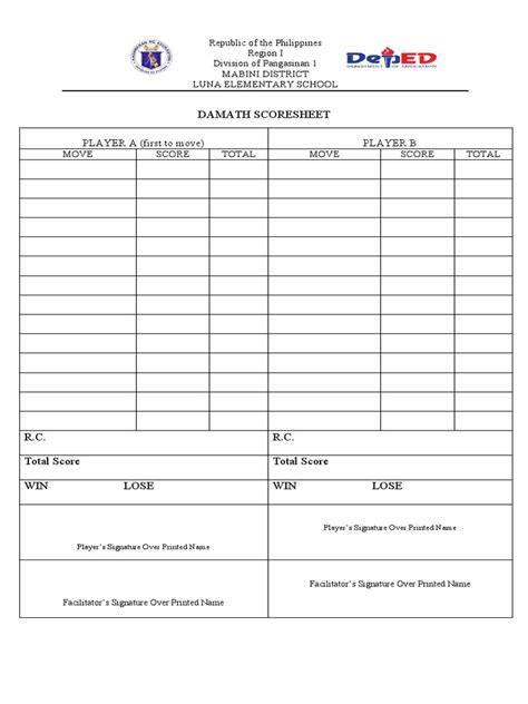 Alright, let’s get down to business and dissect the ISC Damath score sheet . Think of this sheet as your game’s blueprint – without a solid understanding of its structure, you’re basically playing blindfolded. First off, you’ll notice the header. This is usually where you’ll find essential information like the names of the two players , the date of the match , and perhaps the venue or competition name . It’s crucial to fill this out accurately from the get-go. Don’t be that person who forgets to write their name down – it sounds basic, but trust me, it happens! Moving on, the main body of the score sheet is typically divided into sections for each player. You’ll see columns for the round number , the moves made , and most importantly, the points scored . Damath has specific rules for how points are awarded, usually based on forming lines of three or more pieces of the same color. The score sheet will have designated spaces to tally these points for each round. Some sheets might also include a separate section for bonus points or penalties , which can be awarded for specific actions or rule violations. Understanding these nuances is key. For instance, if you make a legal move that results in a ‘Damath’ – meaning you’ve completed a line – you’ll want to make sure that’s clearly marked and the corresponding points are added. On the flip side, if a player makes an illegal move, like moving a piece incorrectly or not capturing when they should, a penalty might be applied, and this needs to be accurately recorded. The sheet often has a running total for each player, so you can see the cumulative score as the game progresses. This is super helpful for keeping track of who’s leading and strategizing your next moves accordingly. It’s not just about the points you score, but also about acknowledging the points your opponent scores. We’re all about fair play here, guys! Lastly, there’s usually a section for the final score and signatures of both players and the arbiter (if present). This signifies the official end of the game and confirms the accuracy of the recorded scores. So, before you even pick up your first piece, take a good look at the score sheet. Familiarize yourself with every box and line. A little preparation goes a long way in ensuring a smooth and fair game for everyone involved. Remember, the score sheet is your best friend in Damath; it keeps everything clear, transparent, and accountable. So, let’s make sure we’re using it to its full potential!