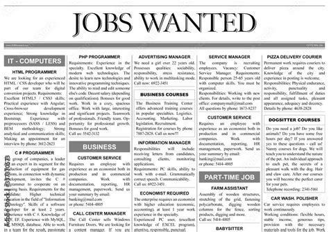 When searching for newspaper job ad examples, consider focusing on specific industries or job types to find the most relevant examples. Also, pay attention to the date of the advertisements, as advertising styles and recruitment practices may have changed over time.