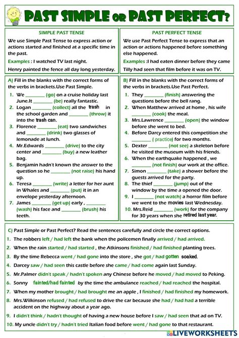 Alright, time to put your knowledge to the test! Here are some exercises to help you practice using the past simple and past perfect tenses. Remember, practice makes perfect, so don’t be afraid to make mistakes – that’s how you learn! Each exercise is designed to help you identify the correct tense based on the context. Pay close attention to the sequence of events and the relationships between them. Some exercises will focus on filling in the blanks, while others will involve rewriting sentences to include the past perfect tense. The goal is to get you comfortable with both tenses and to develop your ability to use them accurately and confidently.