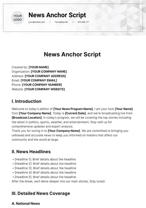 Mastering TV News Scripts: Anchor Samples & TipsOptimizing your skills in TV news anchor script writing and delivery is absolutely crucial in today’s fast-paced media landscape. Whether you’re an aspiring anchor, a seasoned journalist, or just curious about how those engaging news segments come together, understanding the ins and outs of a well-crafted script is key. This article is your ultimate guide, diving deep into the elements that make a TV news script shine, offering insights, and helping you understand what to look for in a sample TV news script PDF . We’re talking about more than just words on a page; we’re talking about the art of storytelling, delivered with clarity, impact, and a touch of human connection. So, buckle up, guys, because we’re about to unveil the secrets behind making every news segment memorable and effective for the audience at home. This comprehensive guide will ensure you’re equipped with the knowledge to not only write exceptional scripts but also to deliver them with the confidence and professionalism of a top-tier news anchor . From the initial research to the final read, every step in the script’s journey is vital for a compelling broadcast, making the search for a perfect TV news script sample PDF an invaluable part of your learning process, offering tangible examples of structure, flow, and professional tone. Understanding how these scripts are constructed, often with specific cues for video, sound, and graphics, provides a holistic view of television production, reinforcing why studying a sample TV news script is so beneficial for anyone looking to excel in broadcast journalism or media production.## Diving Deep into TV News Anchor Scripts: The Foundation of Broadcast ExcellenceAlright, let’s kick things off by really understanding the foundation of broadcast excellence : the TV news anchor script . Guys, this isn’t just a simple piece of paper with words on it; it’s the carefully constructed backbone of an entire news broadcast. Imagine a skyscraper without a solid foundation – it wouldn’t stand a chance, right? Well, a news program without a robust, well-written script is pretty much the same. Every TV news anchor script is meticulously planned to guide the anchor through complex stories, ensure accuracy, maintain flow, and ultimately, keep you, the viewer, engaged and informed. It’s about delivering information in a way that is both authoritative and accessible, making even the most intricate topics understandable for everyone watching. The journey of a news story from a raw event to a polished TV news script is fascinating. It starts with reporters on the ground, gathering facts, conducting interviews, and capturing video. This raw material then lands on the desks of producers and writers, who sift through the information, identify the core narrative, and begin to shape it into a cohesive story. This is where the magic of crafting a TV news anchor script truly begins. They decide what information is most important, how to present it logically, and what emotional tone best suits the story.The goal? To create a TV news script that not only informs but also captivates. It needs to be clear, concise, and conversational. We’re not reading a textbook here; we’re having a conversation with millions of people. This means using language that is easy to understand, avoiding overly academic jargon, and presenting information in a fluid, natural rhythm. A great TV news anchor script anticipates questions the audience might have and answers them proactively, weaving in context and background without overwhelming the viewer. It’s a delicate balance, requiring a deep understanding of journalism, storytelling, and the unique demands of television as a medium.The role of the news anchor in this process is absolutely pivotal. They are the face and voice of the news, the trusted guide who interprets the TV news script and brings it to life. A skilled anchor doesn’t just read words; they interpret them, adding appropriate emphasis, pacing, and tone to convey the full impact of each story. They connect with the audience, making eye contact (with the camera, of course!), and projecting an air of confidence and empathy. This is why when you’re looking for a sample TV news script PDF , you’re not just looking at text; you’re looking at a blueprint for performance. You’re observing how the script is structured to facilitate that engaging delivery, how it allows for natural pauses, and how it directs the anchor’s attention to video clips or graphics.A truly excellent TV news anchor script also serves as a critical tool for consistency and accuracy. In a live broadcast environment, where minutes and seconds count, a well-organized script ensures that all the necessary elements—video, graphics, sound bites, reporter live shots—are seamlessly integrated. It’s a roadmap for the entire production team, ensuring everyone is on the same page, from the director in the control room to the teleprompter operator. This collaborative effort is what ultimately delivers a smooth, professional, and credible newscast. So, when we talk about TV news anchor scripts , remember, we’re talking about the meticulously crafted foundation upon which the entire world of broadcast news is built, demanding precision, clarity, and an innate understanding of how to connect with a diverse audience, often under intense time pressure. It’s about empowering the anchor to be the most effective storyteller they can be, making the TV news script far more than just a document, but a dynamic tool of communication.## The Anatomy of a Stellar TV News Script: Beyond Just WordsAlright, let’s get into the nitty-gritty of what actually makes a stellar TV news script . It’s more than just words on a page, guys; it’s a meticulously designed blueprint for a compelling broadcast. Think of it like a recipe: you need the right ingredients, in the right order, and 
