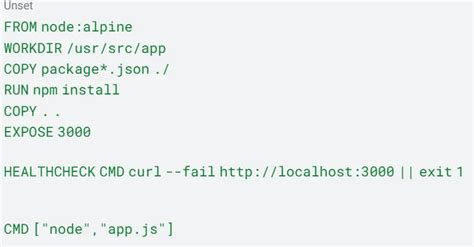 In this example, the COPY instruction copies the healthcheck.sh script into the /usr/local/bin directory in the container. The RUN instruction makes the script executable. The HEALTHCHECK instruction is configured to run the healthcheck.sh script every 5 seconds with a timeout of 3 seconds. Here’s an example of a healthcheck.sh script: