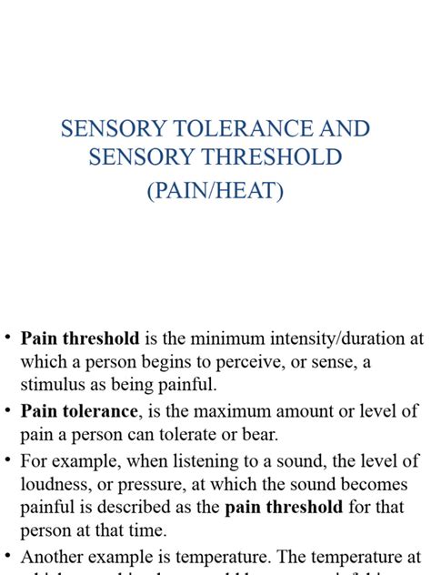 • Treatment: Pain management strategies should be tailored to the individual patient, taking into account their pain threshold, pain tolerance, and other factors that may be influencing their pain perception. This might involve a combination of pharmacological and non-pharmacological approaches. Pharmacological treatments, such as pain relievers, can help to reduce the intensity of pain signals. Non-pharmacological treatments, such as physical therapy, massage, acupuncture, and cognitive behavioral therapy, can help to improve pain tolerance and coping skills. Educating patients about pain threshold and tolerance can also empower them to better manage their own pain. By understanding that pain is a complex and multifaceted phenomenon, patients can learn to identify factors that exacerbate their pain and develop strategies for coping with it.