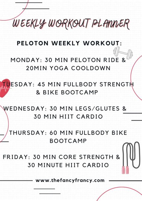 3. Plan Your Weekly Schedule: Now it’s time to create your weekly Peloton workout schedule. Consider your lifestyle, work schedule, and other commitments when planning your workouts. Choose days and times that work best for you and stick to your schedule as consistently as possible. Aim for at least 3-5 workouts per week to see significant results. Variety is key to preventing boredom and overuse injuries. Mix up your workout types to challenge different muscle groups and keep things interesting. For example, you might do an endurance ride on Monday, an interval training session on Wednesday, and a climb ride on Friday. Don’t forget to schedule rest days to allow your body to recover and rebuild.