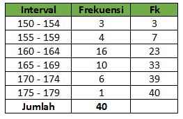 | Nilai (Interval) | Frekuensi | Frekuensi Kumulatif |