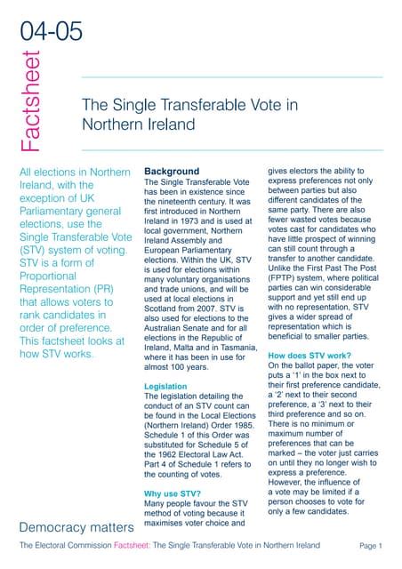• Northern Ireland: STV is used for elections to the Northern Ireland Assembly and local council elections.