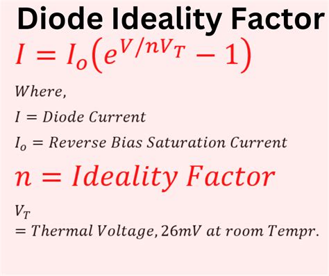 Alright, let’s talk equations! The diode equation is the mathematical expression that describes the current-voltage (I-V) characteristics of a diode. It’s the heart of understanding how a diode behaves in a circuit. The ideality factor is a key component of this equation. Here’s the classic diode equation, with the ideality factor included: