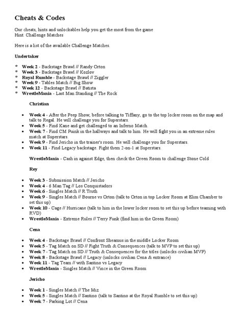 One of the most exciting aspects of using cheat codes is the ability to unlock hidden characters. Imagine stepping into the ring as a wrestler who is not initially available in the base game. Here’s a breakdown of the codes you might encounter to unlock specific wrestlers. These characters often come with unique movesets and entrances, adding a lot of variety to the game. Unlocking these characters can significantly increase the replay value of the game. For instance, you could find codes to unlock classic wrestling legends or special guest characters. These are characters that can add to your roster and create new match-up possibilities. Here is an example of what to expect, but remember the actual codes may vary depending on the source and game version: